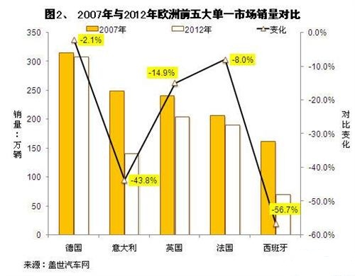 欧洲前五大单一市场中,销量最大的一直是德国,2012年其乘用车销量308.25万辆;其次是英国和法国,2012年销量分别为204.46万辆和189.88万辆;意大利和西班牙则分别以140.21万辆和69.96万辆销量排名第四和第五。而在2007年,这五大市场乘用车销量排名依次是德国、意大利、英国、法国和西班牙。