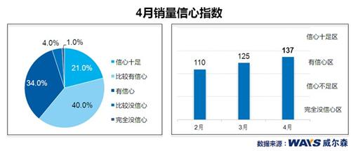 报告显示,4月的上海国际车展及齐鲁春季汽车交易展示会等传统大型车展,将掀起新车发布浪潮,营造浓厚的购车氛围。终端延续3月的店销活动频繁,为市场升温。经销商对4月信心大增,信心指数从125点增加至137点,环比上涨12点,反映经销商有信心。