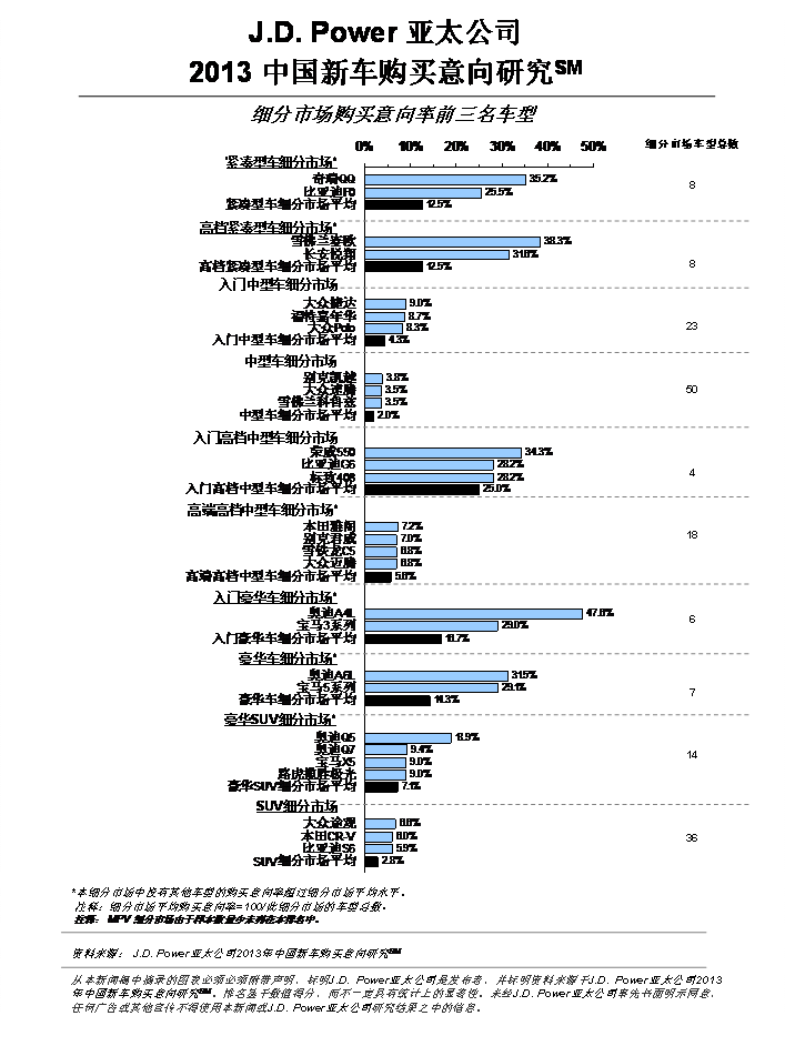 奥迪车型在入门豪华车、豪华车和豪华SUV细分市场中取得了最高意向率,大众车型在入门中型车和SUV细分市场中取得了最高意向率。
