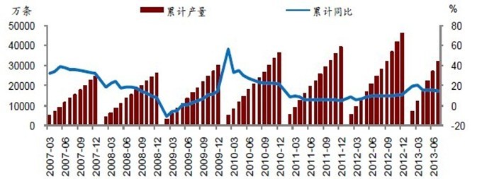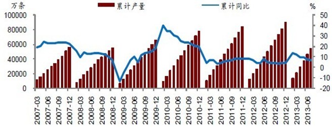 我国轮胎产业发展迅速。2009-2010年,在汽车下乡以及巨额公路建设投资的拉动下,轮胎行业发展迅猛,轮胎产量增速在19%左右。2011年以来,进入了平稳发展时期,2012年,我国轮胎产量的同比增速为4.25%。2013年1-7月,轮胎产量增速为6.69%,显示我国轮胎行业有所回暖。