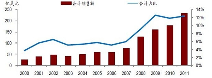 图2:中国入围世界75强轮胎企业合计销售额及占比