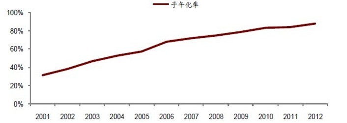 2010年,工信部印发的《轮胎产业政策》提出,2015年,我国乘用车胎子午化率要达到100%,轻型载重车胎子午化率要达到85%,载重车胎子午化率要达到90%。随着子午化技术对斜交胎的替代,以及国家政策的扶植,预计我国轮胎子午化率还将继续提高。