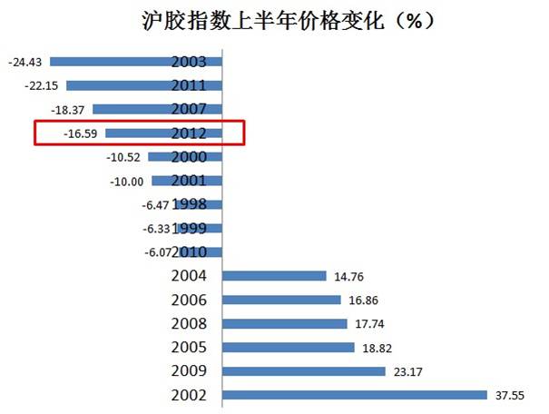 从连续下跌月份个数统计,2012年上半年3月以来,沪胶指数价格连续下跌4个月,已经与2011年全年水平持平,也是2008年金融危机以来的第一次。