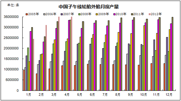 数据显示,2012年至今,中国橡胶制品业完成工业产值同比增长6.47%,综合外胎产量同比增长2.59%,其中子午线轮胎产量同比增长3.13%,全钢子午胎产量同比增长6.55%,子午化率达87.23%,同比提高0.46个百分点。