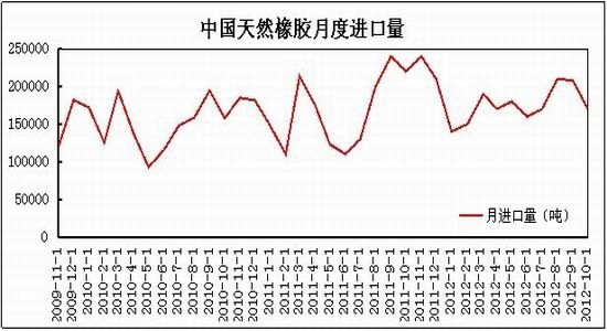 中国10月天然橡胶进口量为17.04万吨,与上月相比下降4万吨,而与去年同期相比下降5万吨。10月橡胶的进口量基本上与1-10月的平均进口量水平持平。该月份橡胶的进口量出现了较大回落,其主要原因是印马泰三国政府在10月份削减出口量;再者,中国国内橡胶的高位库存,使得橡胶贸易商丧失屯货的积极性;最后,目前橡胶销售的低迷,也使得橡胶进口量难以出现大量的增加。