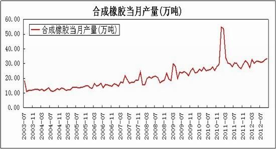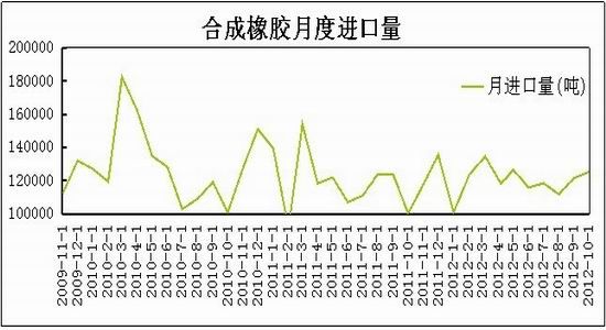 2012年9月份开始,受输美轮胎“特保案”到期的影响,贸易商陆续备战轮胎出口,导致合成橡胶进口量连续两个月增加。10月份,国内合成橡胶的产量为33.53万吨,环比增加0.81万吨,同比增加6.93万吨。加之11月底前期检修的合成橡胶装置陆续开工,合成橡胶的价格将继续下行。
