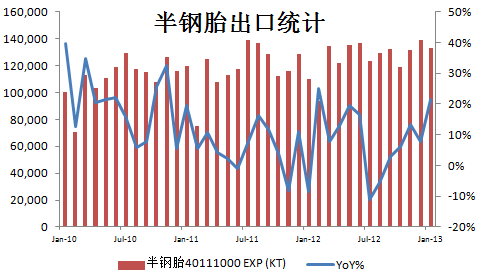 1月,中国半钢胎共计出口13.34万吨,之前出口量连续三个月环比大增,10、11、12月出口量分别为11.9万吨、13.1万吨、13.9万吨,2012年1月出口量为11万吨。半钢胎出口单价在过去的一年里持续下滑,累计下跌幅度为10.3%,1月份暂显稳定,为3.67美元/公斤。