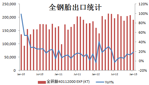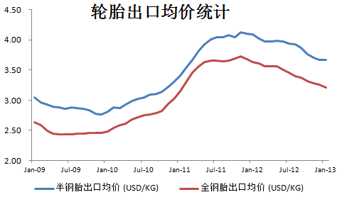 1月,中国全钢胎共计出口19.04万吨,10、11、12月出口量分别为18.7万吨、20.4万吨、20.8万吨,2012年1月出口量为16.1万吨。全钢胎出口单价在过去的一年里持续下滑,累计下跌幅度为11.5%,1月份继续较12月份下跌3美分/公斤,至3.22美元/公斤。