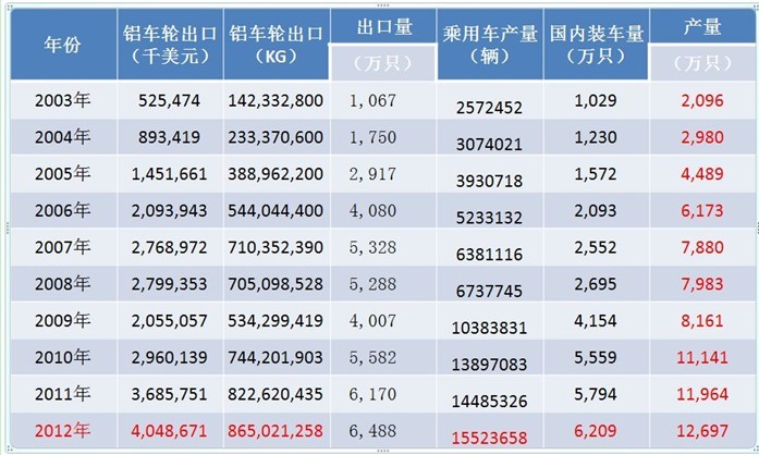 “2013中国铝合金轮毂行业后装市场经营高峰论坛”日前在广州举行。会上,中国汽车工业协会车轮委员会副秘书长王孝东发布了近十年中国铝车轮产量及其区域分布情况、铝车轮进出口数据等,并预测了今年铝车轮的发展形势。