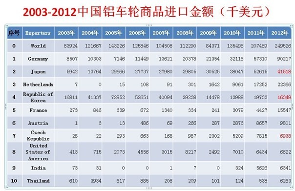 按查询结果,铝车轮及相关商品进口额由2003年的0.8亿美元增加到2012年的2.5亿美元。(如下图) 出口额方面,近10年,铝车轮及相关商品出口额增加近8倍,由2003年的5.3亿美元增加到2012年的40.5亿美元。(如下图)