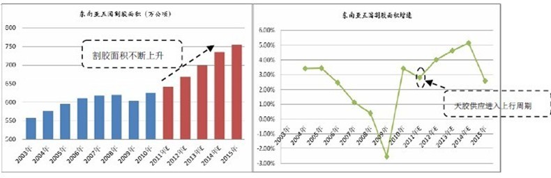 2005-2008年,由于天然橡胶价格大涨,东南亚国家种植了大量的橡胶树。2003年-2004年,东南亚五国(泰国、印尼、马来西亚、印度、越南)新增种植面积13.6万公顷,更新种植面积17.7万公顷;2005 -2008年,东南亚五国(泰国、印尼、马来西亚、印度、越南)新增种植面积105.8万公顷,更新种植面积44.2万公顷。