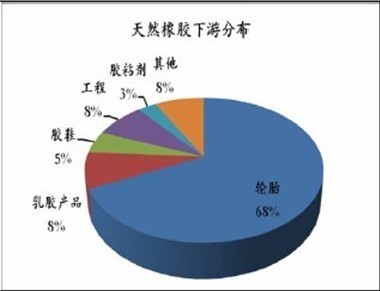 天然橡胶下游最大的需求是轮胎(65%)、其次为乳胶产品(8%)、工程(8%)、胶鞋(5%)、胶粘剂(3%)、其他(8%)。天然橡胶由于生长特性,一般集中在北纬20°以内生长。因此,天然橡胶的产量主要集中在东南亚地区,如泰国、印尼、马来西亚、印度、越南、中国、以及非洲部分地区。我国天然胶生产主要集中在海南、云南、广东地区,而由于我国天然橡胶产不足需,自给率逐年下降,至2009年,我国天然橡胶自给率已到29%。因此,国内天然橡胶的价格主要跟随国际天胶价格波动。其中东南亚五国(泰国、印尼、马来西亚、印度、越南)产量占全球产量82%。