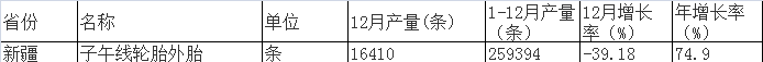 中商情报网数据显示,2012年新疆子午线轮胎外胎产量为259394条。