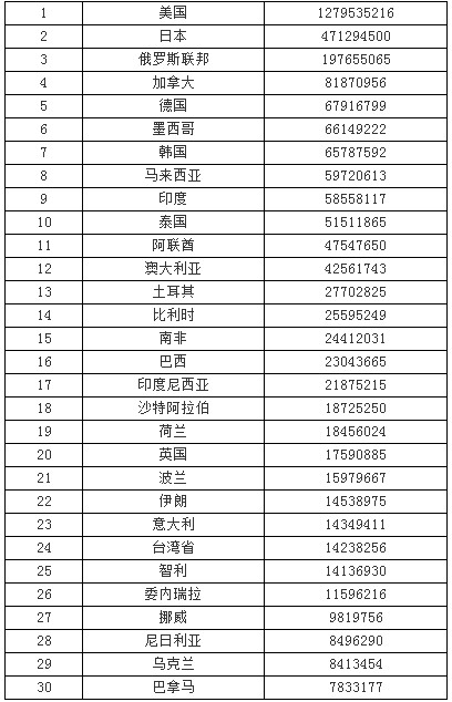该产品1-9月份共出口到171个国家和地区,其中出口排名前30位名单及出口金额(美元)如下表: