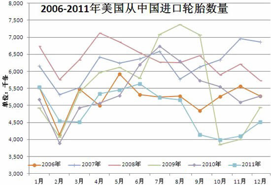 数据显示,2011年,美国共进口轮胎196011千条,同比微增0.55%。从图中可以看出,该年进口量与2007年(2007年进口量为2000年以来最高)相差无几。