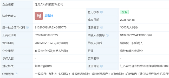 资料显示,久行科技成立于2025年9月18日,注册资本3000万元。