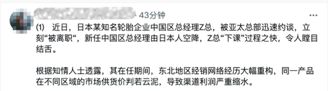 该博主称,日前,某轮胎企业中国区总经理,被亚太总部约谈。