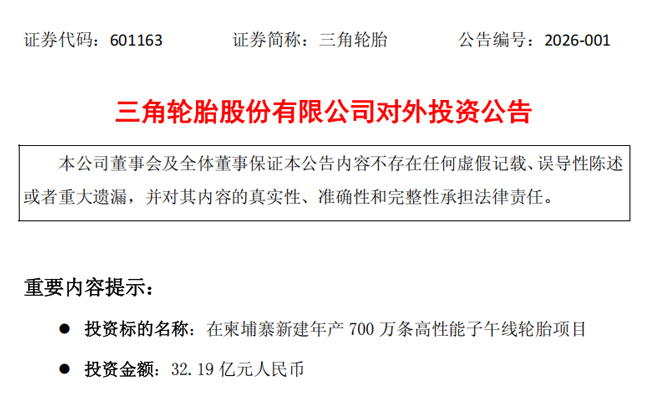 1月15日,三角轮胎股份有限公司,宣布重大投资计划。