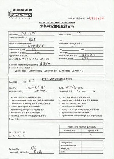 陈先生在发现此问题追究责任时,沃尔沃4S店与米其林轮胎厂家就开始 相互“踢皮球”。4S店工作人员称,轮胎问题不在保修范围之内,且此问题与车辆无关,为轮胎质量问题或消费者使用问题导致,并让车主到轮胎厂家指定的地点去做检测。而米其林厂家检测的结果报告书显示,其原因为“定位偏移或机械原因导致偏磨”,并称这是车辆的问题,或是行驶路面的问题导致。