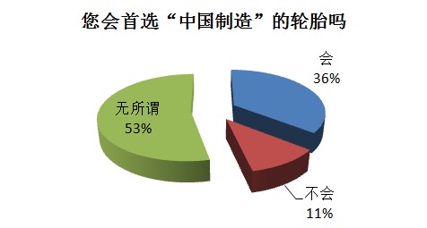 第二个调查题目是:您会首选“中国制造”的轮胎吗?结果显示,投票者在此问题上的分歧较大。其中,超过半数(53%)的投票者选择了“无所谓”;36%的投票者表示“会”;其余一成的参与者选择了“不会”。