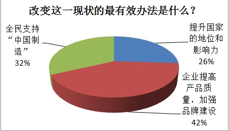 那么,改变这一现状最有效的办法是什么呢?在此问题的三个选项中,支持率最高的是:企业提高产品质量,加强品牌建设。有超过四成的参与者选择了该项。支持率最低的选项则是:提升国家地位和影响力,支持率为26%。此外,“全面支持‘中国制造’”选项的投票率占到32%,也占了不小的比例。