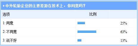 截至12月3日,调查结果显示,对于“中外轮胎企业的主要差距在技术上”的说法,有25%的参与者选择了“同意”,63%的参与者表示“不同意”,另有13%的人士选择了“说不好”。