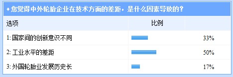 关于导致技术差距的具体原因,根据调查内容,认为“国家间创新意识不同”的,占33%;认为是“工业水平存在差距”的占半壁江山;选择“外国轮胎业发展史长”的,占17%。