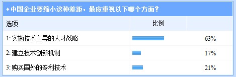 在这个问题上,认为企业应该“实施技术为主导的人才战略”的,占据超过六成(63%)的比例。另外两个选项所占比例相差无几,17%的人士认为轮胎企业应该“建立技术创新机制”,21%的人士选择了“购买国外专利技术”一项。