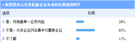 面对“多元化是轮胎企业的发展趋势吗”的问题,超过6成的受访者选择了“不是”,他们认为,在竞争越来越激烈的市场情况下,大多数企业未来仍会集中力量做主营业务,如果分散精力和资金在新业务上,则很可能会面临“两面不讨好”的局面;有26%的受访者选择了“是”,认为企业应该多元化发展,理由是:这样做可以规避单一业务存在的风险,也就是“不能将鸡蛋放在一个篮子里”;此外,有1成人士表示对这个话题不了解。