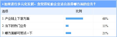 在“如果进行多元化发展,轮胎企业该选择那些方面”这一话题中,再次出现了一边倒的情况,有68%的受访者认为,应从轮胎产业链的上下游方面考虑,实现资源的优化配置;11%的人支持企业发展当下的热门业务;另有21%的受访者表示,只要有精力和资金,各方面都可以尝试一下,以便寻找出适合自己的发展方向。