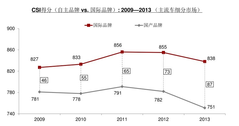J.D.Power亚太公司发布的中国售后服务满意度研究(CSI)报告显示,2013年,在主流车市场,国际品牌汽车CSI平均得分(1000分制)为838;国产品牌汽车CSI平均得分为751,差距明显。对比历年CSI得分,国产品牌与国际品牌在售后满意度上,更是呈现差距日渐拉大的趋势。