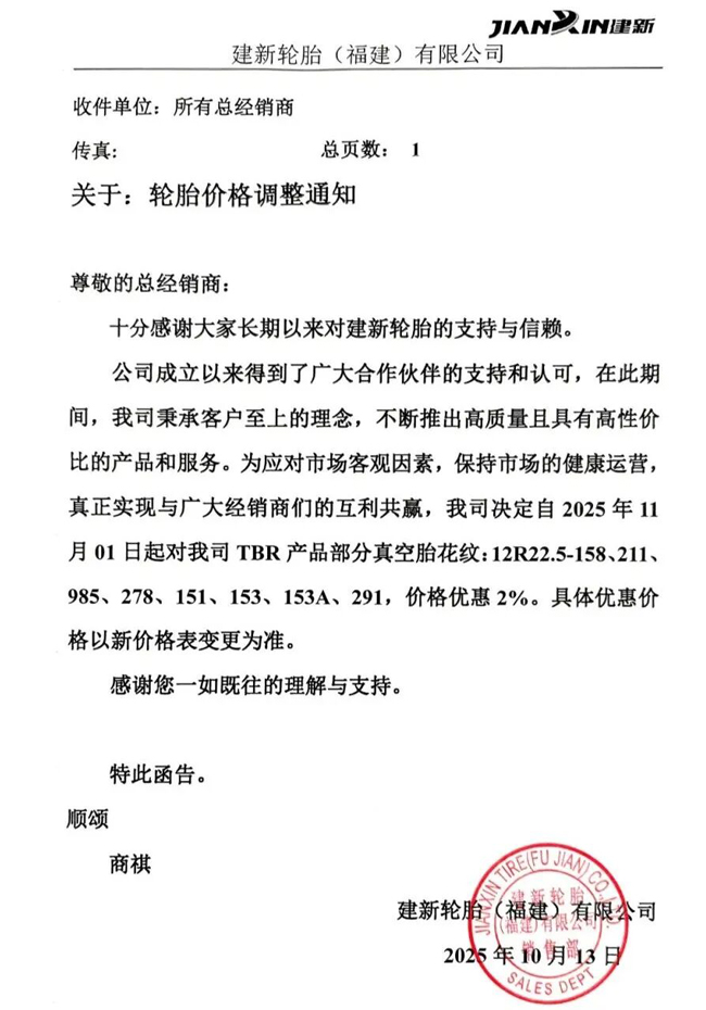 10月13日,建新轮胎(福建)有限公司,发布一份降价通知。