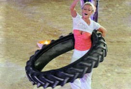 网易视频日前制作“疯狂汽车挑战秀”专辑,下图为专辑中的一个视频剪图:美女转动卡车轮胎。该女子名叫莎宾娜,她可以像转呼啦圈一样转动一个50公斤重的卡车轮胎连续30下,时间是2分钟。