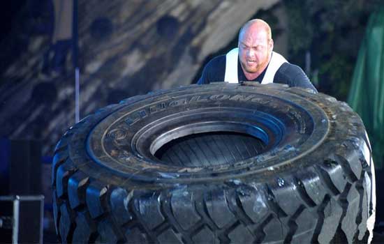 图为7月8日比赛现场,大力士在进行“翻轮胎”比赛。