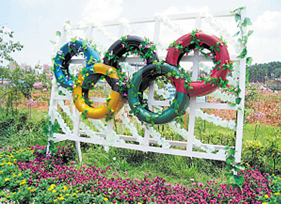 日前,湖南省森林植物园“夏之恋”2012湖南世界名花展之“花·生活·艺术”创意花展举行,其中,有参与者用5只废旧轮胎布置成奥运五环形状,引来观众驻足欣赏。