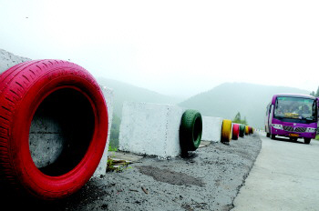 淄中路连接淄川区和沂源县,全部是山路,弯道多,青松岭路段最深处距沟底近百米,是事故的多发地段。为此,区交通运输局投资50多万元,设立了185个长1.2米、高和宽均为0.6米的水泥防护墩,事故虽然有所减少,但效果并不明显。