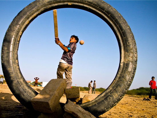 板球是一项充满激情的运动,是很多印度男人的最爱。这幅照片是在印度资源匮乏的农村拍摄,当地板球迷将废旧的轮胎当成球门,用木板制成简易球杆,尽情享受板球比赛带给他们的快乐。