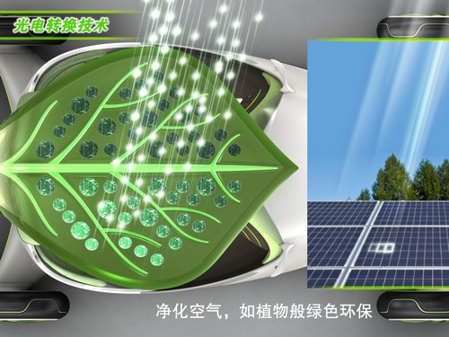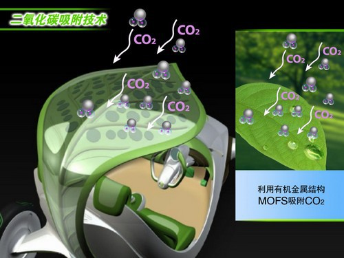 “叶子”车体采用可吸附二氧化碳的有机金属结构(MOFs),能模拟绿色植物从空气中捕获二氧化碳和水分子,在微生物的作用下释放出电子,形成电流。生物燃料电池再将产生的电能给锂电池充电,由电机驱动汽车。同时,它还能将光电转换中排放的高浓度二氧化碳通过激光发生器转化为电能为车内照明,或转化为车内空调制冷剂,不仅仅是“零排放”,更是“负排放”的实现,净化空气,缓解温室效应,改善自然环境。