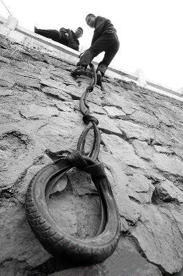 日前,在位于山西大同建设路南沙河北沿岸处,有一根由7条旧轮胎捆绑而成的“软梯”,挂在河坝边上,有5米多长,不时有市民爬梯上下。由于该处施工封锁了双塔南巷的进出口,不少市民为图方便,“发明”了这根软梯。然而,很多人认为,路程虽减短了,却并不安全。