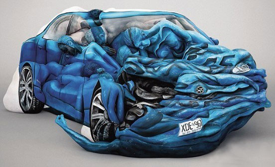 去年,南澳大利亚汽车事故委员会为呼吁大家不要超速,邀请知名人体彩绘艺术家Emma Hack共同创作了“一辆被撞坏的大众汽车”。这辆被撞歪的车,由5位女模和12位男模组成。Emma Hack的团队花费18小时才完成这件作品,成果相当逼真,冲撞后扭曲变形的细微质感都被真实的表现出来。