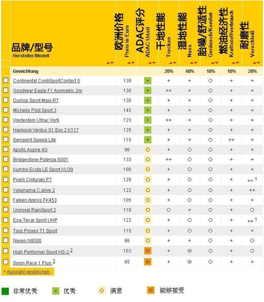 ADAC2013年针对19款规格为225/45 R17夏季轮胎的测试结果