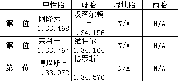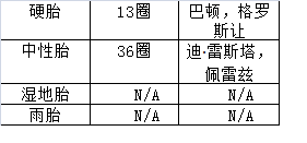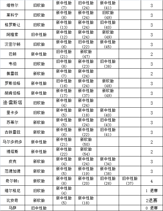 自比赛开始,车队采用的轮胎策略就各不相同:法拉利车队的两位车手阿隆索与马萨、迈凯轮车手简森·巴顿、索伯车手尼科·胡肯伯格,以及在第十一位出发的梅赛德斯车手尼科·罗斯伯格等七位车手均以中性胎起跑。