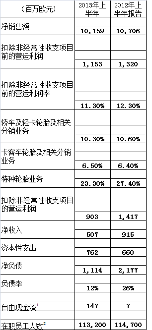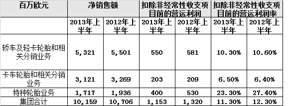 2013年前6个月,米其林扣除非经常性收支项目前合并营运利润占据净销售额的11.3%,为11.53亿欧元。同期,非经常性支出为2.5亿欧元,涉及正在进行的改善制造业务竞争力的项目产生的重组成本。