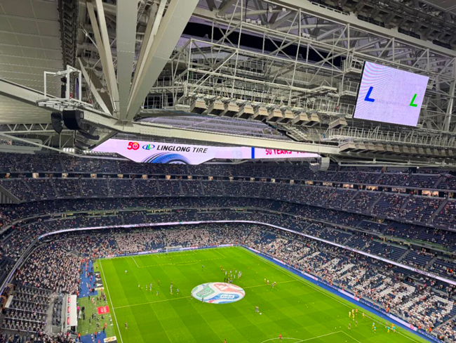 “玲珑50年”与玲珑轮胎品牌标志,在伯纳乌球场上展示。