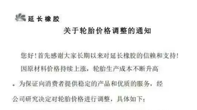 前有已有约60家轮胎企业,发布价格调整通知,涨幅在2%-3%之间。