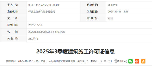 10月16日,安徽省蚌埠市怀远县,披露今年第3季度建筑施工许可证信息。