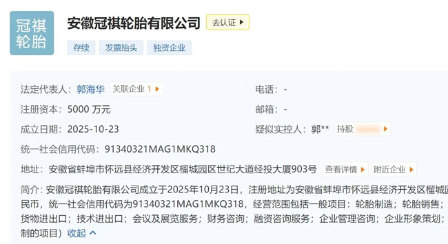资料显示,冠祺轮胎成立于2025年10月23日,注册资本5000万元。