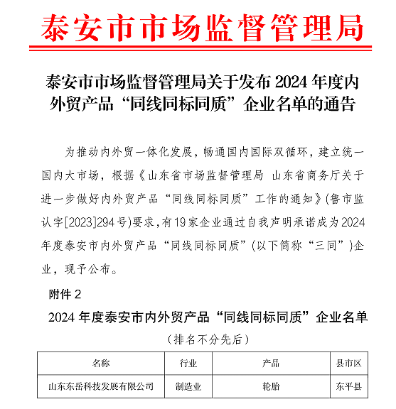 东岳轮胎成功入选2024年内外贸产品“同线同标同质”企业名单。