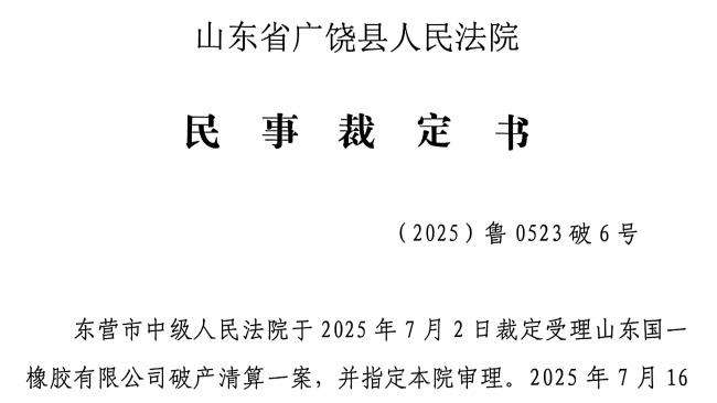 公告称,法院已于7月2日,受理山东国一橡胶有限公司破产清算一案。