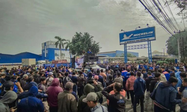 工人们聚集在工厂外围抗议示威,导致附近的交通中断。